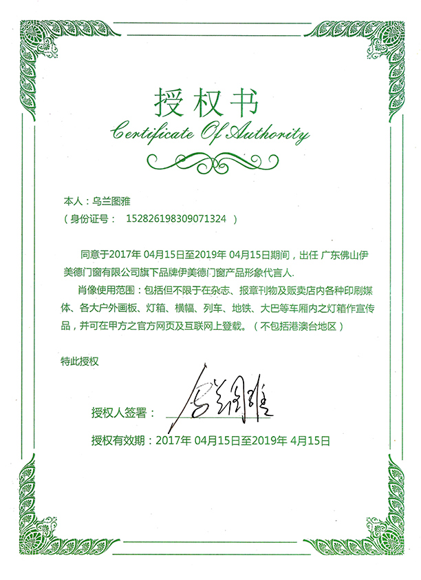 首頁>品牌> 公司榮譽(yù)>烏蘭圖雅2017-2019年度形象代言授權(quán)書