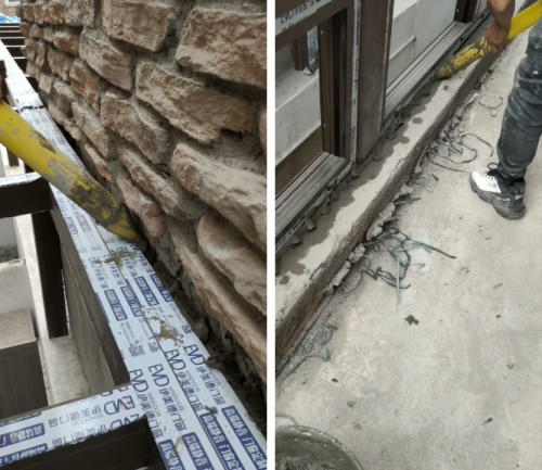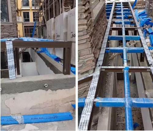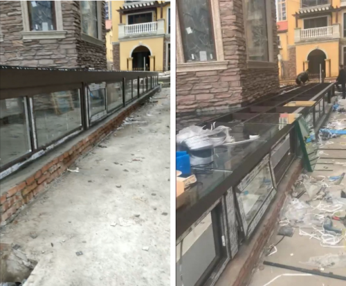 (3)陽光房型材與別墅外墻之間,窗框與臺基之間用水泥填充,水泥干固后再打上防水膠。