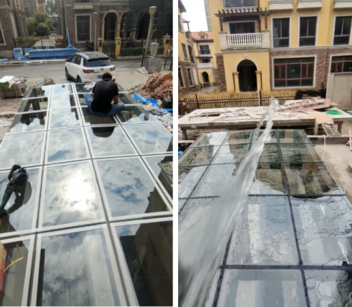 (5)鋪好房頂玻璃,打上滿滿的密封膠,然后做防水測試,往房頂噴上大流量自來水。