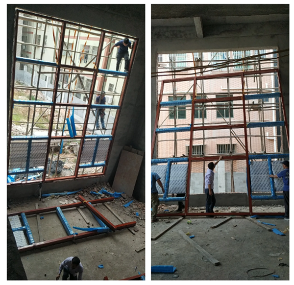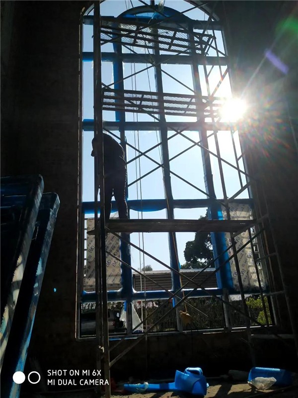 兩層高落地窗的安裝是全過程里難度最大的,不過伊美德團隊駕輕就熟,他們合力吊起窗框,調(diào)整好水平與垂直度,不怕高空危險逐級爬上,在四周的窗框與墻體之間打好足夠數(shù)量的螺絲。落地窗面積大,面對的風壓打,所以窗框與墻體之間必須加固,螺絲夠粗,間隔夠密,鋁合金門窗廠家伊美德決不為節(jié)省一點成本而損害安全性。